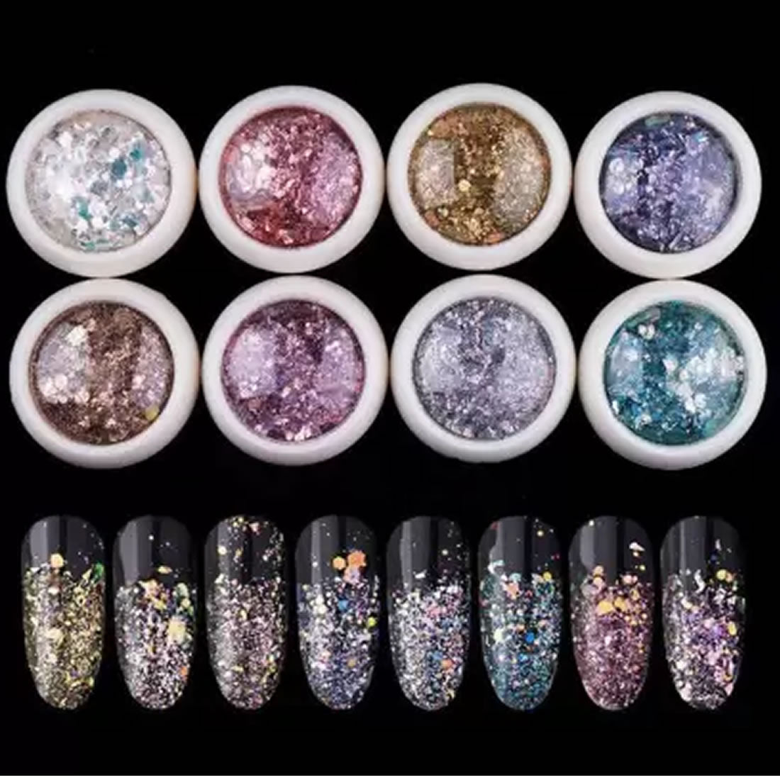 Nail sequin powder DIY Nail art decal Multi-functions: Used it as cosmetic glitter for Mardi Gras festivities. Used it for slime or a hard gel manicure. Used it for sorority recruitment Used it to make fun ice cubes for a party Perfect for my eye shadow tutorials Perfect for face glitter makeup, hair, boday or nail art Used to make card, cell phone's case and other art, craft project. Used to wear as glitter makeup for a fancy Galactic party, Halloween Party, Coachella, mermaid themed party etc. Gift for resin artist Perfect gifts for every rave girl who loves to sparkle. Package includes 8 jars with 8 colors