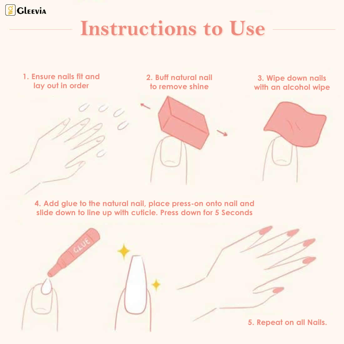 - Align the press-on nails, to your natural nails. Press down and hold firmly for 15-20 seconds to ensure strong hold.